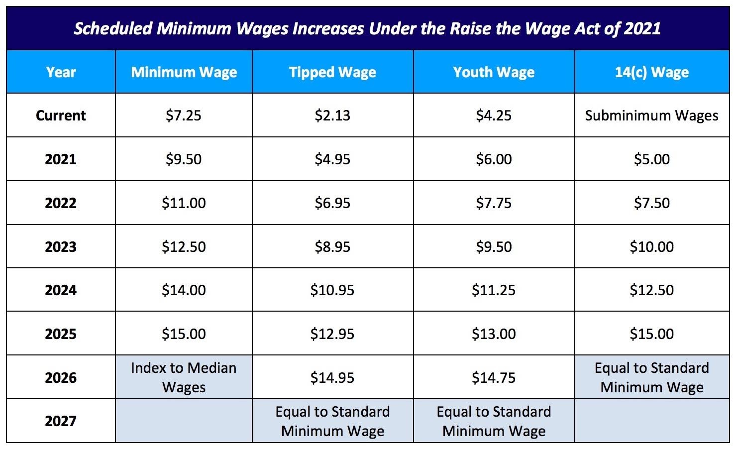 On January 26, 2021, U.S. House and Senate Democratic leadership introduced the Raise the Wage Act of 2021 that seeks to raise the federal minimum wage to $15/hour incrementally over the next four years. After that, the federal minimum wage would increase in line with median hourly wage growth. The following chart illustrates the scheduled minimum wage increases if the Act is passed: