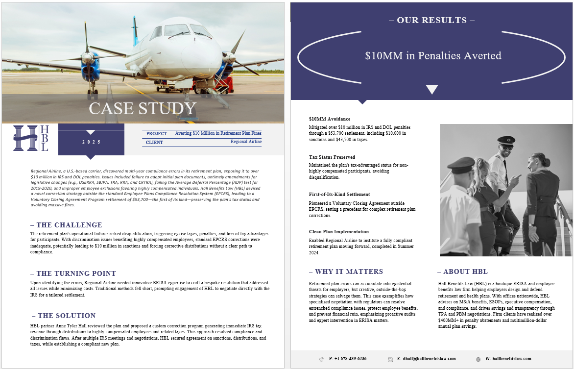 Regional Airline, a U.S.-based carrier, discovered multi-year compliance errors in its retirement plan, exposing it to over $10 million in IRS and DOL penalties. Issues included failure to adopt initial plan documents, untimely amendments for legislative changes (e.g., USERRA, SBJPA, TRA, RRA, and CRTRA), failing the Average Deferral Percentage (ADP) test for 2019-2020, and improper employee exclusions favoring highly compensated individuals. Hall Benefits Law (HBL) devised a novel correction strategy outside the standard Employee Plans Compliance Resolution System (EPCRS), leading to a Voluntary Closing Agreement Program settlement of $53,700—the first of its kind—preserving the plan’s tax status and avoiding massive fines.