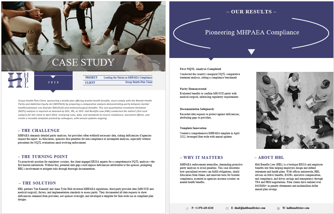 Group Health Plan Client, sponsoring a health plan offering mental health benefits, must comply with the Mental Health Parity and Addiction Equity Act (MHPAEA) by preparing a comparative analysis demonstrating parity between mental health/substance use disorder (MH/SUD) and medical/surgical benefits. This non-quantitative treatment limitation (NQTL) analysis is required on demand by DOL, IRS, or HHS. Hall Benefits Law (HBL) conducted the nation’s first such analysis for this client in April 2022, reviewing rules, data, and standards to ensure compliance, document efforts, and create a reusable template praised by colleagues, with annual updates ongoing.