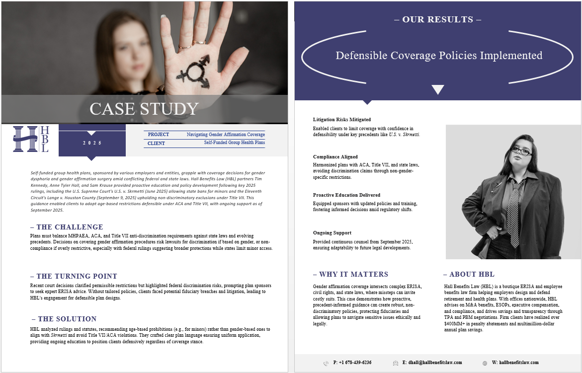 Self-funded group health plans, sponsored by various employers and entities, grapple with coverage decisions for gender dysphoria and gender affirmation surgery amid conflicting federal and state laws. Hall Benefits Law (HBL) partners Tim Kennedy, Anne Tyler Hall, and Sam Krause provided proactive education and policy development following key 2025 rulings, including the U.S. Supreme Court’s U.S. v. Skrmetti (June 2025) allowing state bans for minors and the Eleventh Circuit’s Lange v. Houston County (September 9, 2025) upholding non-discriminatory exclusions under Title VII. This guidance enabled clients to adopt age-based restrictions defensible under ACA and Title VII, with ongoing support as of September 2025.