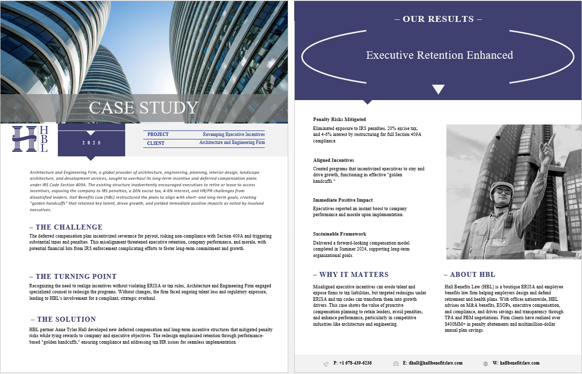 Architecture and Engineering Firm, a global provider of architecture, engineering, planning, interior design, landscape architecture, and development services, sought to overhaul its long-term incentive and deferred compensation plans under IRS Code Section 409A. The existing structure inadvertently encouraged executives to retire or leave to access incentives, exposing the company to IRS penalties, a 20% excise tax, 4-6% interest, and HR/PR challenges from dissatisfied leaders. Hall Benefits Law (HBL) restructured the plans to align with short- and long-term goals, creating “golden handcuffs” that retained key talent, drove growth, and yielded immediate positive impacts as noted by involved executives.
