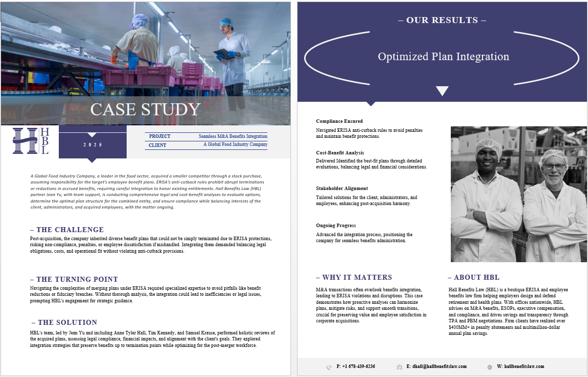 A Global Food Industry Company, a leader in the food sector, acquired a smaller competitor through a stock purchase, assuming responsibility for the target’s employee benefit plans. ERISA’s anti-cutback rules prohibit abrupt terminations or reductions in accrued benefits, requiring careful integration to honor existing entitlements. Hall Benefits Law (HBL) partner Jean Yu, with team support, is conducting comprehensive legal and cost-benefit analyses to evaluate options, determine the optimal plan structure for the combined entity, and ensure compliance while balancing interests of the client, administrators, and acquired employees, with the matter ongoing.