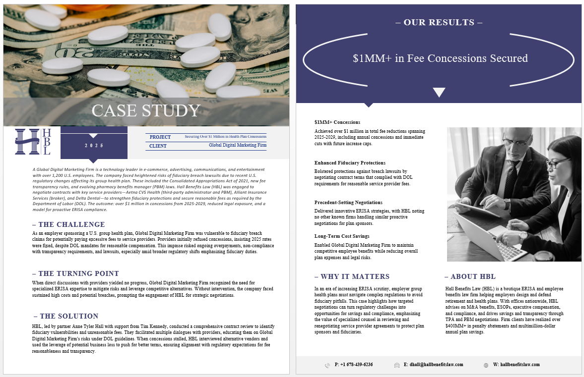 A Global Digital Marketing Firm is a technology leader in e-commerce, advertising, communications, and entertainment with over 1,200 U.S. employees. The company faced heightened risks of fiduciary breach lawsuits due to recent U.S. regulatory changes affecting its group health plan. These included the Consolidated Appropriations Act of 2021, new fee transparency rules, and evolving pharmacy benefits manager (PBM) laws. Hall Benefits Law (HBL) was engaged to negotiate contracts with key service providers—Aetna CVS Health (third-party administrator and PBM), Alliant Insurance Services (broker), and Delta Dental—to strengthen fiduciary protections and secure reasonable fees as required by the Department of Labor (DOL). The outcome: over $1 million in concessions from 2025-2029, reduced legal exposure, and a model for proactive ERISA compliance.