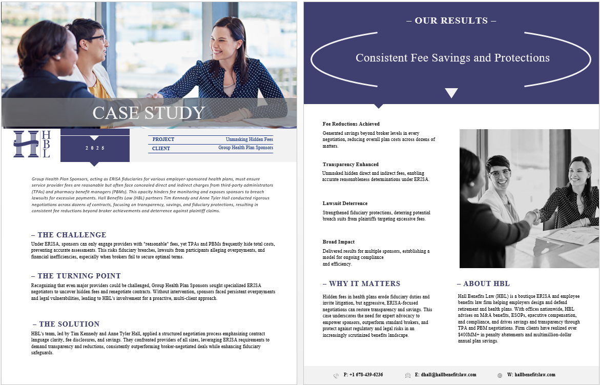 Hall Benefits Law (HBL) is a boutique ERISA and employee benefits law firm helping employers design and defend retirement and health plans. With offices nationwide, HBL advises on M&A benefits, ESOPs, executive compensation, and compliance, and drives savings and transparency through TPA and PBM negotiations. Firm clients have realized over $400MM+ in penalty abatements and multimillion-dollar annual plan savings.