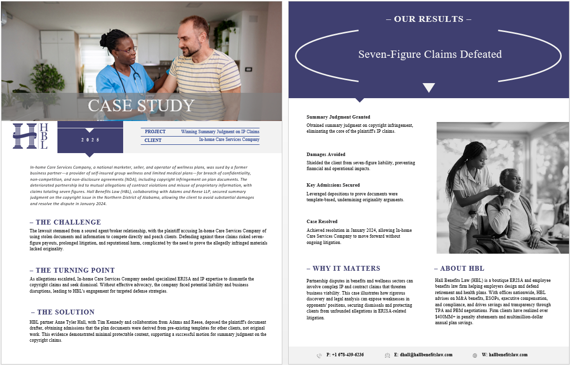 In-home Care Services Company, a national marketer, seller, and operator of wellness plans, was sued by a former business partner—a provider of self-insured group wellness and limited medical plans—for breach of confidentiality, non-competition, and non-disclosure agreements (NDA), including copyright infringement on plan documents. The deteriorated partnership led to mutual allegations of contract violations and misuse of proprietary information, with claims totaling seven figures. Hall Benefits Law (HBL), collaborating with Adams and Reese LLP, secured summary judgment on the copyright issue in the Northern District of Alabama, allowing the client to avoid substantial damages and resolve the dispute in January 2024.