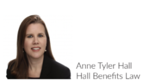 Anne Tyler Hall, Founding Attorney and Principal, Hall Benefits Law As a business owner representing businesses, Anne Tyler understands first-hand the importance of strategically-designed, legally-compliant benefit plans aimed at attracting, motivating, and retaining top employees. She also understands the importance of responsive and timely legal compliance guidance to businesses who are in six and seven-figure Internal Revenue Service, Department of Labor, or Department of Health and Human Services penalty situations. Anne Tyler Hall is a 2017 and 2018 Super Lawyers Rising Star, an honor determined through peer nominations, professional achievement, evaluations, and independent research. Anne Tyler also maintains a Martindale Hubbell rating of Preeminent, representing the highest achievement of professional excellence based upon client and peer review. When not counseling clients on fiduciary matters, healthcare reform, executive compensation, health and welfare benefits, and retirement plan legal issues, Anne Tyler enjoys running 5K races and cycling with her husband and spending quality time with her two daughters.