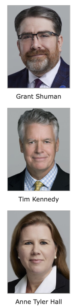 Grant Shuman and Tim Kennedy are partners, and Anne Tyler Hall is a managing partner, at Hall Benefits Law.